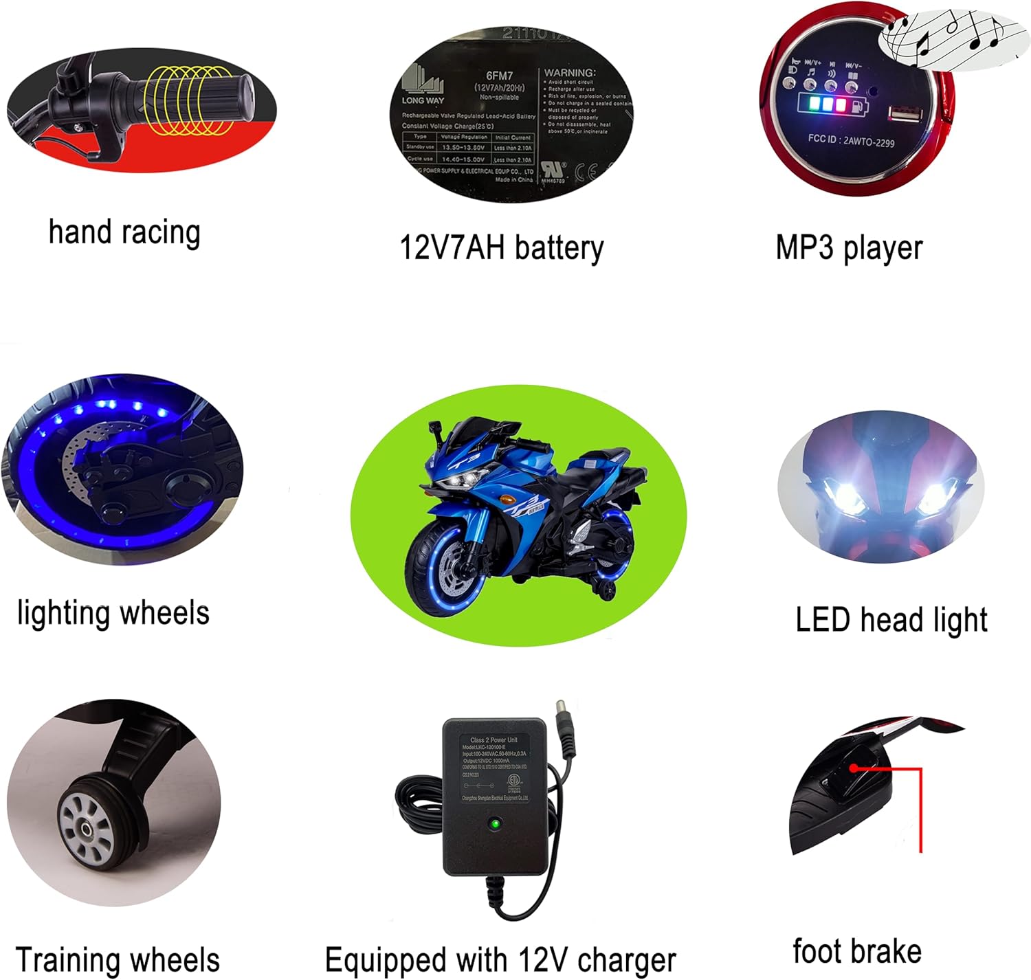 The motorcycle also includes music and sound functions for added entertainment and features a durable frame designed for kids aged 3–5 years old with a maximum load of 66 lbs.